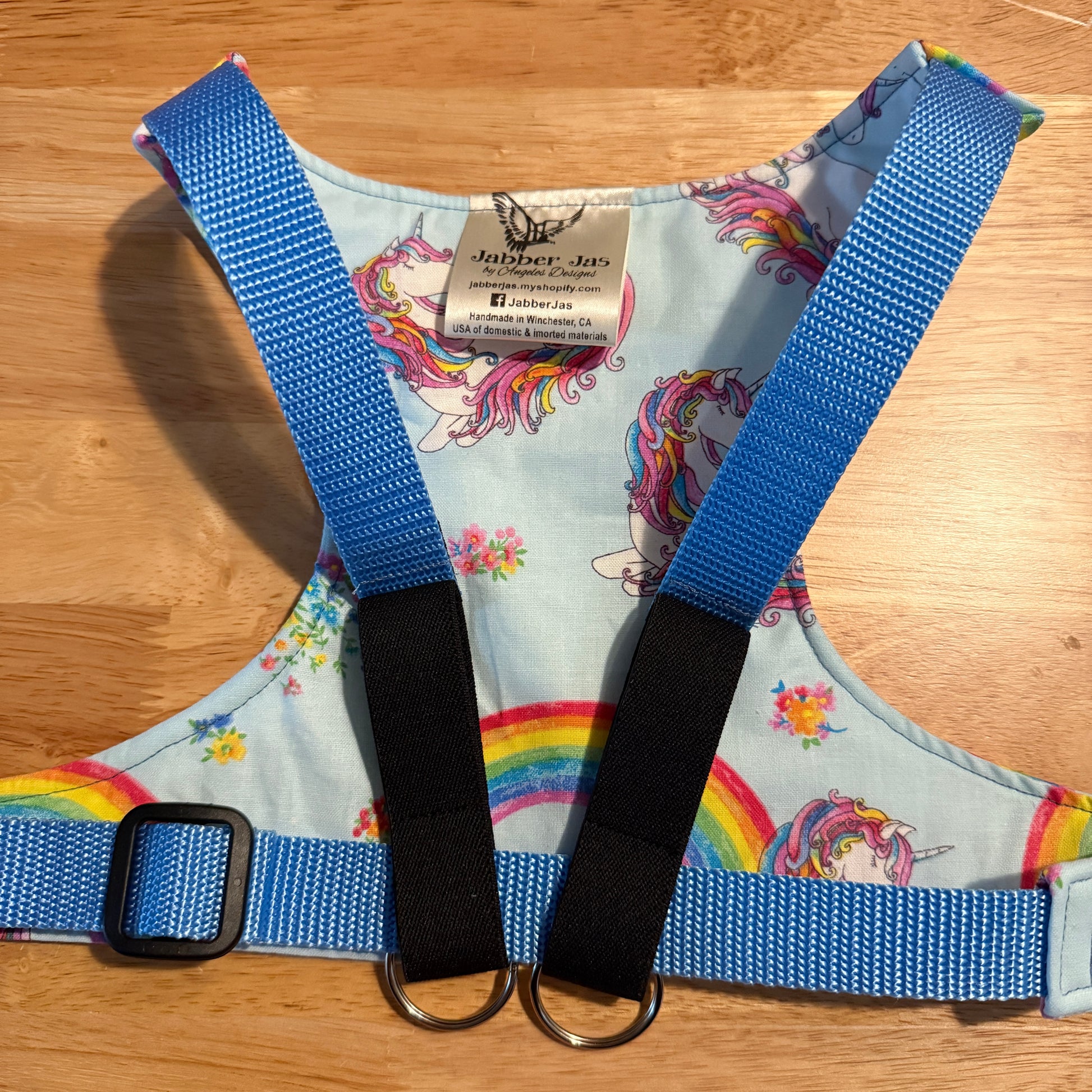 Blue background. Floral, unicorn, and rainbow print. Powdered blue straps. Size medium. Ready to ship